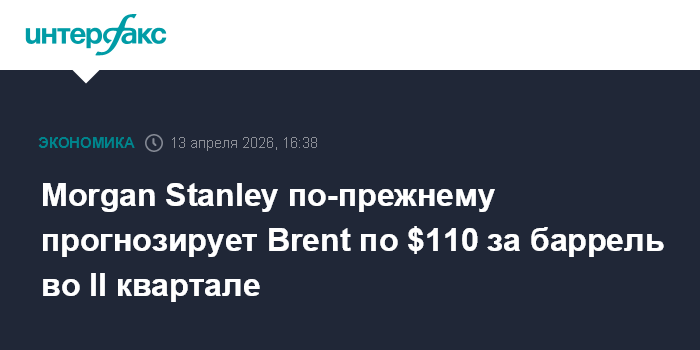 Москва. 13 апреля. INTERFAX.RU - Аналитики Morgan Stanley сохранили прогноз для средней цены нефти марки Brent на второй квартал текущего года на уровне $110 за баррель и на третий квартал на уровне $100 за баррель, сообщает Reuters со ссылкой на сам банк.
