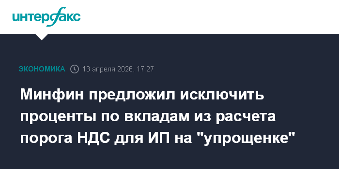 Москва. 13 апреля. INTERFAX.RU - Минфин предложил разрешить индивидуальным предпринимателям (ИП) на упрощенной системе налогообложения (УСН), доход которых за 2025 г. не превысил 60 млн руб., не учитывать проценты по банковским вкладам в РФ при определении порога доходов для освобождения от НДС.