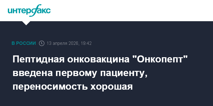 "Первому пациенту препарат введён 31 марта 2026 года. Сейчас ему проведено уже третье введение вакцины. Переносимость вакцины хорошая. Для следующего пациента вакцина "Онкопепт" уже готова, первое введение планируется 20 апреля 2026 года", - говорится в сообщении пресс-службы агентства в понедельник.