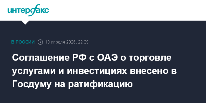 Москва. 13 апреля. INTERFAX.RU - В Госдуму внесен законопроект о ратификации соглашения о торговле услугами и инвестициях между правительством Российской Федерации и правительством Объединенных Арабских Эмиратов.