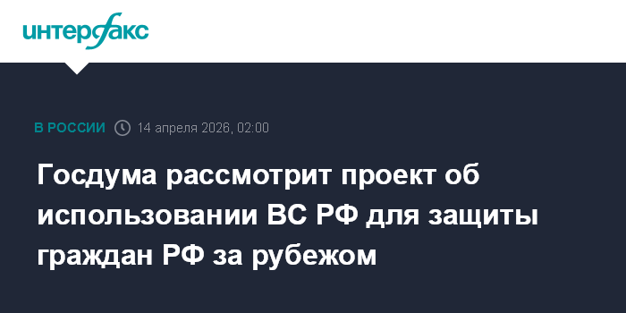 Москва. 14 апреля. INTERFAX.RU - Госдума на заседании во вторник рассмотрит в первом чтении проект закона о возможности экстерриториального использования по решению президента РФ формирований Вооруженных сил России для защиты россиян, сообщил первый заместитель председателя Госдумы Александр Жуков.