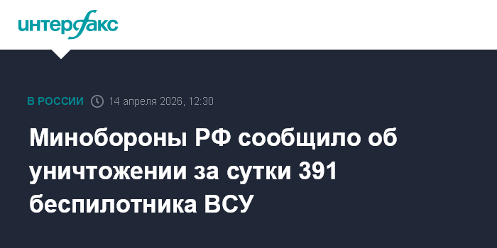 Москва. 14 апреля. INTERFAX.RU - Российскими военными в течение суток уничтожены 391 украинский беспилотник и два морских дрона, сообщили в Минобороны РФ во вторник.