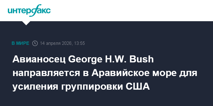 Москва. 14 апреля. INTERFAX.RU - Американская авианосная ударная группа во главе с авианосцем USS George H.W. Bush направляется в Аравийское море в зону ответственности Центрального командования ВС США на Ближнем Востоке (CENTCOM). Об этом сообщила информационная служба Военно-морского института Соединенных Штатов.