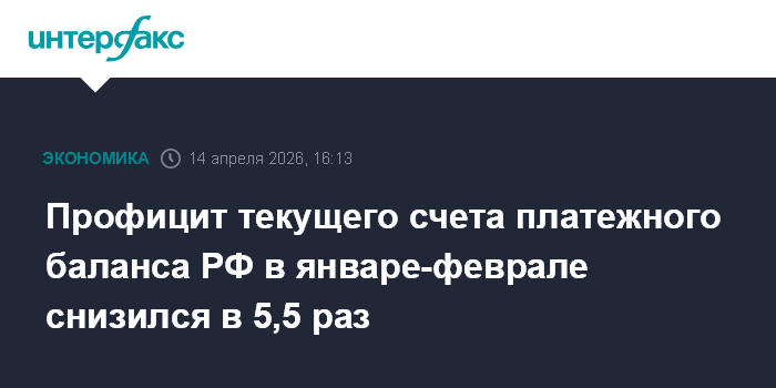 Москва. 14 апреля. INTERFAX.RU - Положительное сальдо счета текущих операций платежного баланса РФ в январе-феврале 2026 года составило $1,9 млрд, что в 5,5 раз меньше по сравнению с аналогичным периодом 2025 года, когда оно равнялось $10,4 млрд, следует из оценки платежного баланса, опубликованной на сайте Банка России.