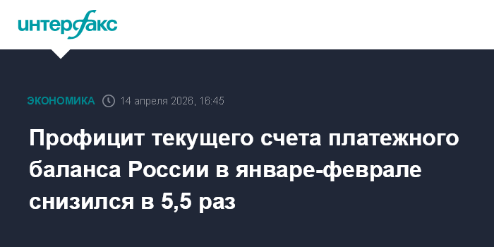 Москва. 14 апреля. INTERFAX.RU - Положительное сальдо счета текущих операций платежного баланса России в январе-феврале 2026 года составило $1,9 млрд, что в 5,5 раз меньше по сравнению с аналогичным периодом 2025 года, когда оно равнялось $10,4 млрд, следует из оценки платежного баланса на сайте Банка России.