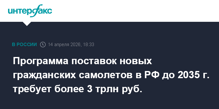 Москва. 14 апреля. INTERFAX.RU - Реализация программы поставок так называемой второй партии новых гражданских самолетов в РФ до 2035 года требует фондирования в объеме более 3 трлн руб., сообщил замглавы Минпромторга Геннадий Абраменков.