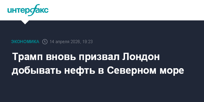 Москва. 14 апреля. INTERFAX.RU - Президент США Дональд Трамп заявил, что на фоне нехватки энергоносителей в Европе Великобритания должна активизировать разработку нефтегазовых месторождений в Северном море.
