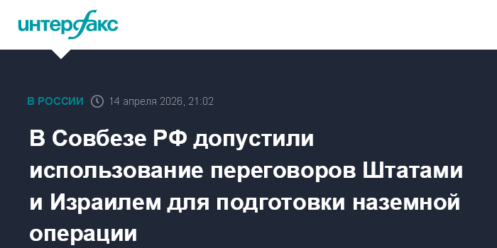 Москва. 14 апреля. INTERFAX.RU - Мирные переговоры могут быть использованы США и Израилем для подготовки к наземной операции против Ирана, есть вероятность, что в случае неудачного переговорного процесса по истечении двух недель боевые действия могут возобновиться даже с большей интенсивностью, заявили в аппарате Совета безопасности РФ во вторник.