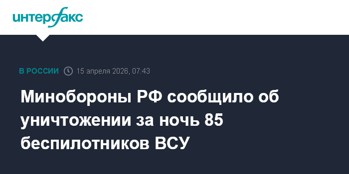 Москва. 15 апреля. INTERFAX.RU - Средствами ПВО в течении ночи с 20:00 вторника до 07:00 среды уничтожены 85 украинских БПЛА, сообщили в Минобороны РФ.