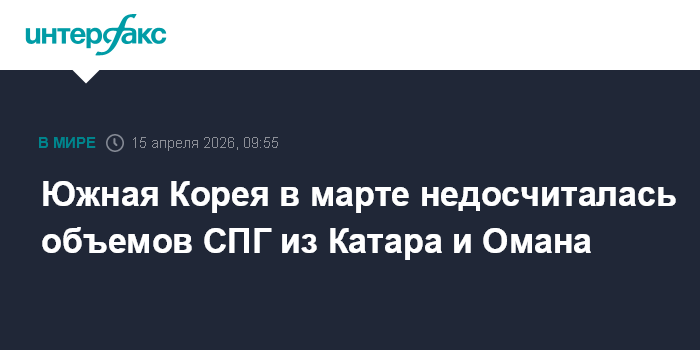 Южная Корея - третий после Японии и Китая покупатель сжиженного природного газа в мире - в марте 2026 года импортировала 3,836 млн тонн СПГ, что на 10% меньше, чем годом ранее, сообщила местная таможенная служба. С начала года поставки растут на 5,5% - до 12,714 млн тонн.