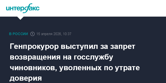Москва. 15 апреля. INTERFAX.RU - Генпрокурор РФ Александр Гуцан высказался за законодательный запрет для чиновников, уволенных в связи с утратой доверия, повторно устраиваться на госслужбу.