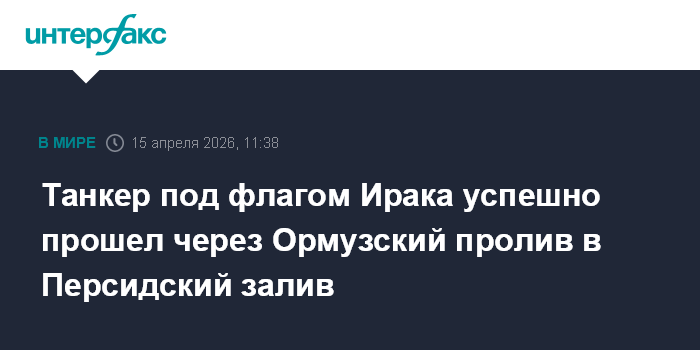 Москва. 15 апреля. INTERFAX.RU - Супертанкер Agios Fanourios I под флагом Ирака прошел из Ормузского пролива в Персидский залив, он стал первым нефтевозом, идущим через этот водный путь на северо-запад с момента введения блокады пролива со стороны США, сообщает в среду Bloomberg.