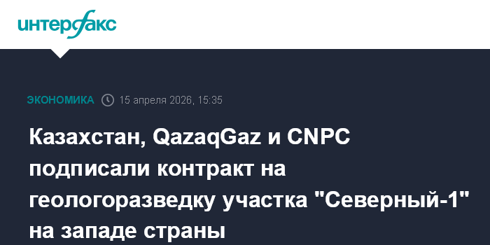 Москва. 15 апреля. INTERFAX.RU - Министерство энергетики Казахстана, госкомпания QazaqGaz и АО "CNPC-Актобемунайгаз" заключили контракт на проведение геологоразведочных работ на участке "Северный-1" в Актюбинской области, сообщила пресс-служба Минэнерго.