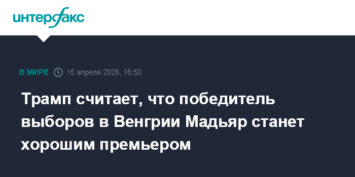 Москва. 15 апреля. INTERFAX.RU - Президент США Дональд Трамп заявил, что лидер одержавшей победу на парламентских выборах в Венгрии партии "Тиса" Петер Мадьяр будет хорошо работать на посту премьера.