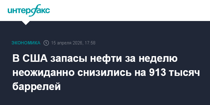 Москва. 15 апреля. INTERFAX.RU - Коммерческие запасы нефти в США на неделе, которая завершилась 10 апреля, снизились на 913 тысяч баррелей, до 463,8 млн баррелей, сообщило Минэнерго страны.