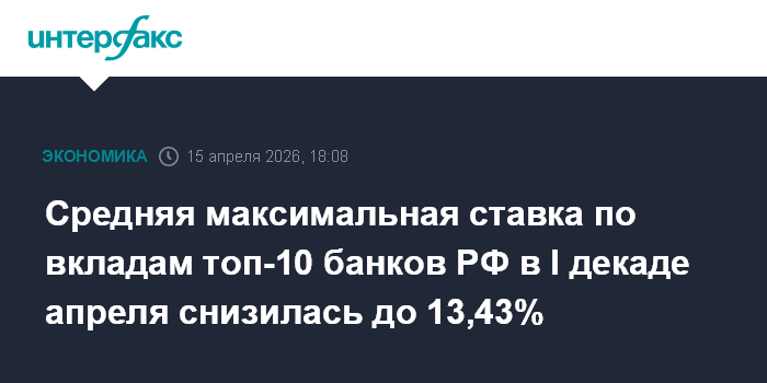 Москва. 15 апреля. INTERFAX.RU - Среднее арифметическое значение максимальных процентных ставок, определенное для банков топ-10 по рублевым вкладам без учета вкладов с дополнительными условиями, в первой декаде апреля 2026 года снизилось до 13,43% с 13,56% в третьей декаде марта, сообщает сайт Банка России.