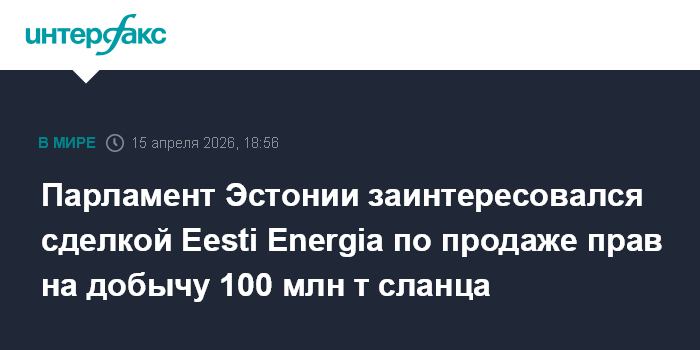 Москва. 15 апреля. INTERFAX.RU - Парламент Эстонии заинтересовался сделкой государственного энергетического концерна Eesti Energia по продаже эстонскому сланцеперерабатывающему концерну Viru Keemia Grupp (VKG) прав на добычу более 100 млн тонн сланца.