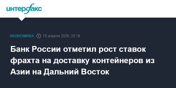 Москва. 15 апреля. INTERFAX.RU - Стоимость морских перевозок контейнеров из стран Азии на Дальний Восток к началу апреля выросла на 18,5% по сравнению с ноябрем 2025 года - февралем 2026 года и более чем на четверть в годовом выражении, в том числе из-за увеличения цен на топливо, отмечается в апрельском докладе Банка России по региональной экономике.