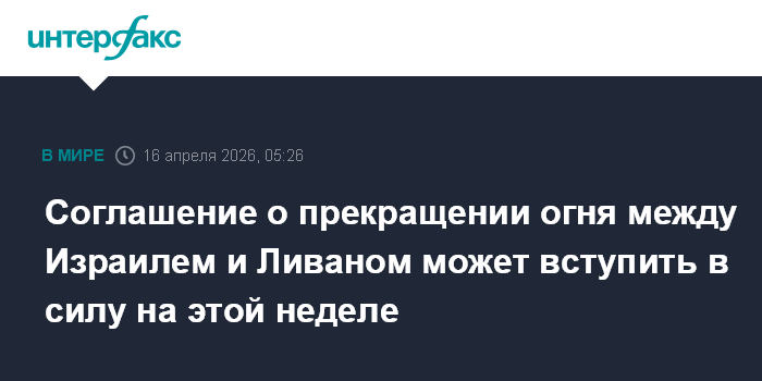 Москва. 16 апреля. INTERFAX.RU - Соглашение о прекращении огня между Израилем и Ливаном может вступить в силу в ближайшее время, сообщает Financial Times со ссылкой на осведомленные источники.