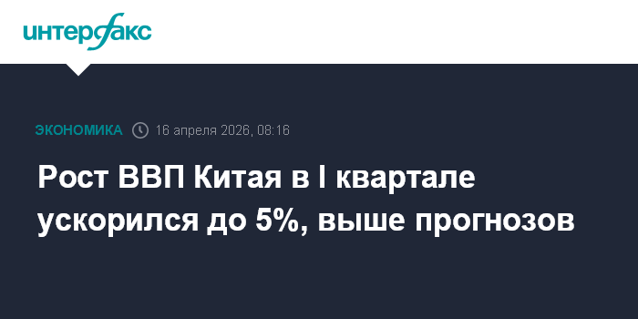 Москва. 16 апреля. INTERFAX.RU - Экономика Китая в первом квартале 2026 года увеличилась на 5% в годовом выражении - до 33,4 трлн юаней ($4,87 трлн), сообщило Государственное статистическое управление КНР.
