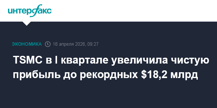 Москва. 16 апреля. INTERFAX.RU - Ведущий мировой производитель чипов на заказ Taiwan Semiconductor Manufacturing Company зафиксировал рекордную чистую прибыль в первом квартале 2026 года благодаря ажиотажному спросу на продвинутые чипы, используемые в работе технологий искусственного интеллекта.