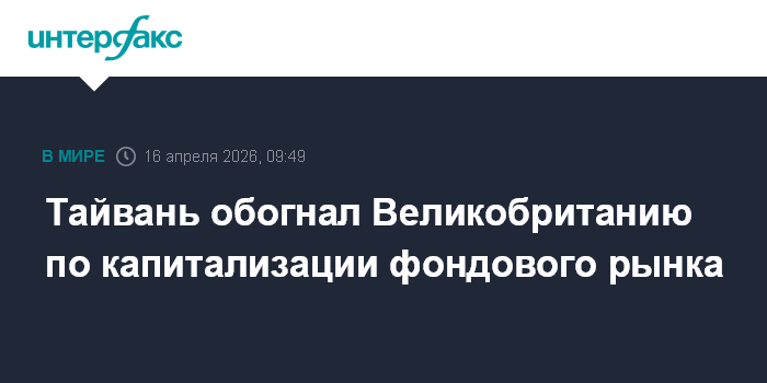 Тайвань опередил Великобританию, чей рынок акций оценивается в $4,09 трлн. При этом годовой ВВП Тайваня составляет $977 млрд против $4,3 трлн у Великобритании, по данным Международного валютного фонда (МВФ).