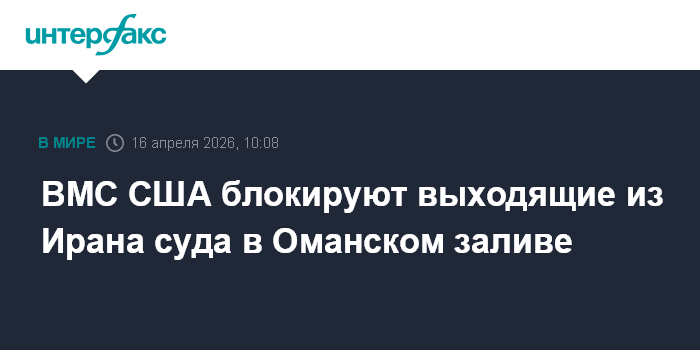 Москва. 16 апреля. INTERFAX.RU - Корабли ВМС США проводят в Оманском заливе операции по блокаде выходящих из Ирана судов, сообщило Центральное командование ВС США на Ближнем Востоке CENTCOM.