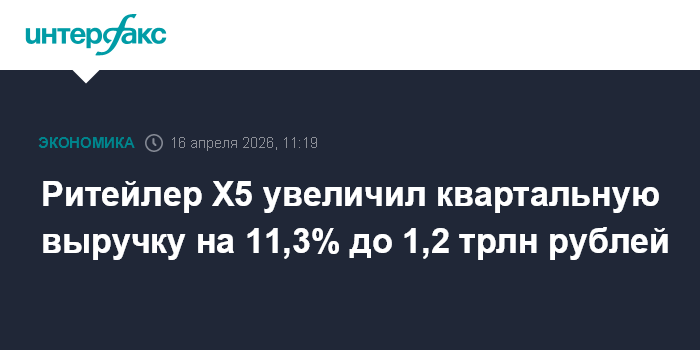 Москва. 16 апреля. INTERFAX.RU - ПАО "Корпоративный центр ИКС 5" в I квартале 2026 года увеличило выручку на 11,3% до 1,19 трлн рублей, сообщила компания.
