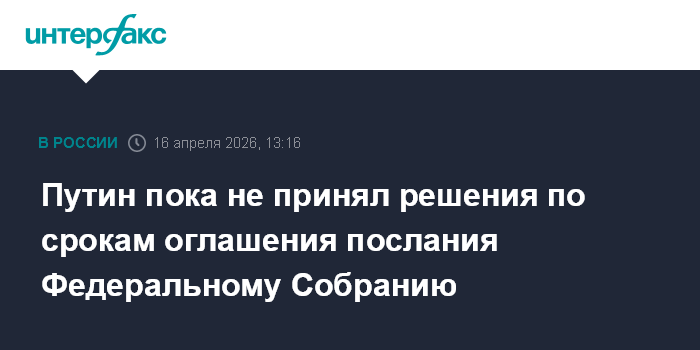 Москва. 16 апреля. INTERFAX.RU - Президент РФ Владимир Путин пока не принял решение по срокам оглашения послания Федеральному Собранию.