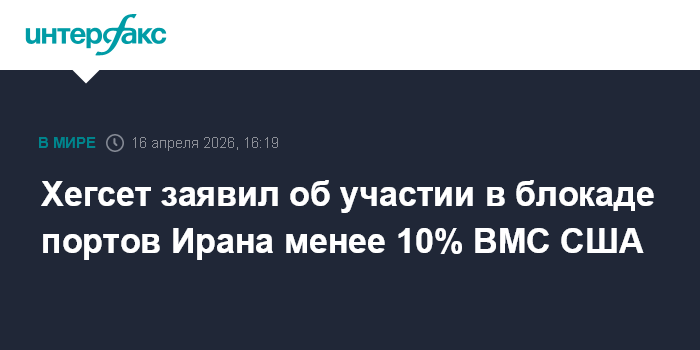 Москва. 16 апреля. INTERFAX.RU - ВМС США контролируют движение судов в Ормузский пролив и из него, используя "менее 10% американских военно-морских сил", заявил на пресс-конференции глава Пентагона Пит Хегсет.