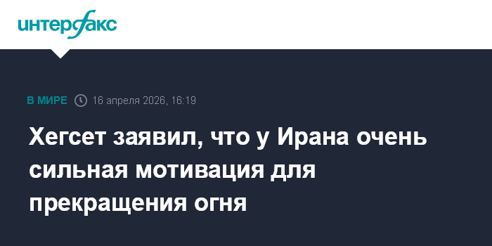 Москва. 16 апреля. INTERFAX.RU - Мотивация Ирана для прекращения огня очень велика, заявил в четверг на пресс-конференции глава Пентагона Пит Хегсет.