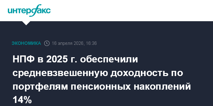 Москва. 16 апреля. INTERFAX.RU - Негосударственные пенсионные фонды (НПФ) по итогам 2025 года показали положительную средневзвешенную доходность по пенсионным накоплениям 14,0% и по пенсионным резервам - 16,2%, говорится в сообщении Банка России.