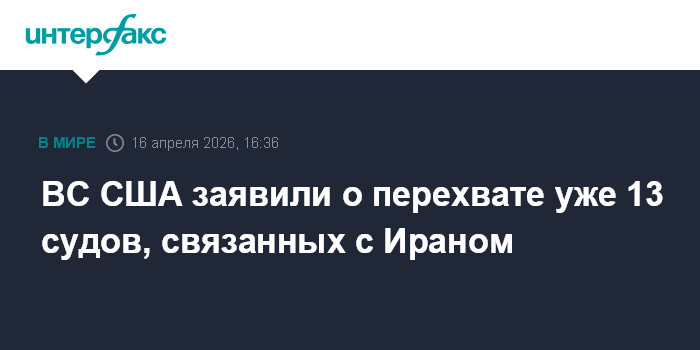 Москва. 16 апреля. INTERFAX.RU - ВМС США с начала блокады перехватили уже 13 судов, вышедших из иранских портов, сообщил на пресс-конференции в Пентагоне председатель Объединенного комитета начальников штабов (ОКНШ) ВС США генерал Дэн Кейн.