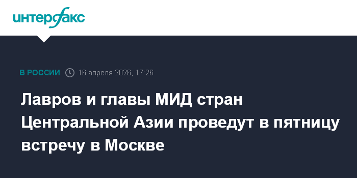 Москва. 16 апреля. INTERFAX.RU - Министр иностранных дел России Сергей Лавров 17 апреля проведет встречу с главами внешнеполитических ведомств стран Центральной Азии, сообщила официальный представитель МИД РФ Мария Захарова.
