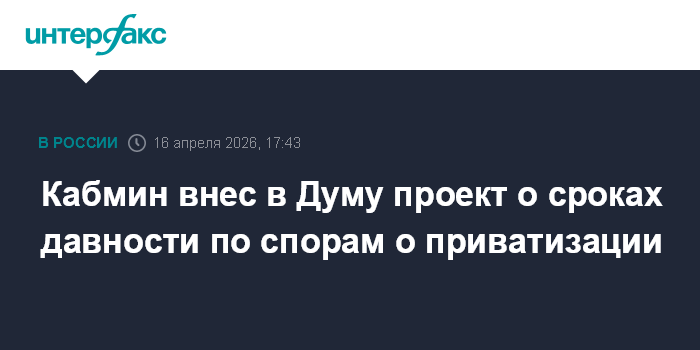 Москва. 16 апреля. INTERFAX.RU - Правительство РФ внесло в Госдуму законопроект, ограничивающий сроки исковой давности по искам об истребовании имущества, выбывшего из государственной и муниципальной собственности в результате приватизации.