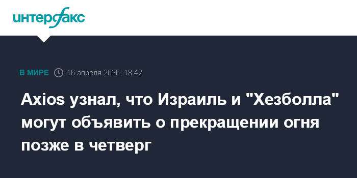Москва. 16 апреля. INTERFAX.RU - Израильская сторона и ливанское движение "Хезболла" могут заключить соглашение о прекращении огня позже в четверг, сообщает в четверг портал Axios со ссылкой на источник.