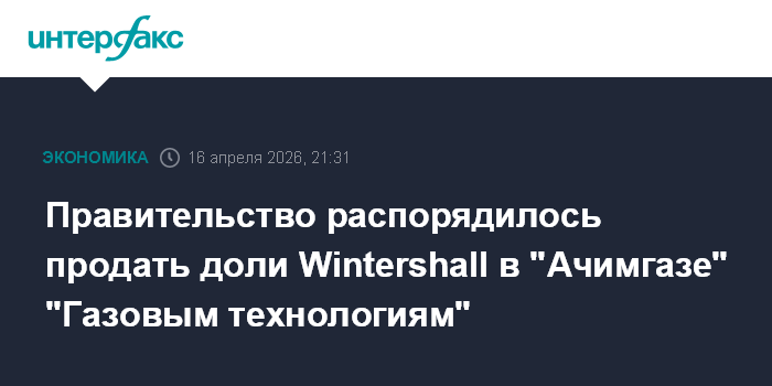 Москва. 16 апреля. INTERFAX.RU - Премьер-министр РФ Михаил Мишустин подписал распоряжение о продаже ООО "Газовые технологии" долей в компаниях ООО "Ачим девелопмент", ООО "Ачимгаз" и ООО "Ачим сбыт", которые ранее принадлежали германской Wintershall.