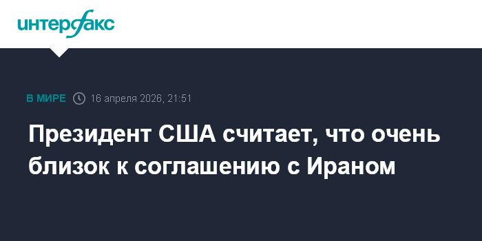 Москва. 16 апреля. INTERFAX.RU - США очень близки к заключению соглашения по спорным вопросам с Ираном, заявил в четверг американский президент Дональд Трамп.