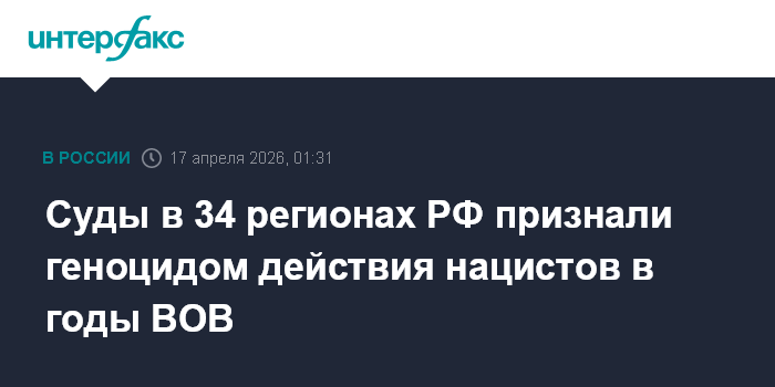 Москва. 17 апреля. INTERFAX.RU - Суды 34 регионов России подтвердили факт геноцида советского населения со стороны нацистов и их пособников во время Великой Отечественной войны (ВОВ); на специальном портале можно ознакомиться с этой информацией, сообщила руководитель Национального центра исторической памяти при президенте РФ Елена Малышева.