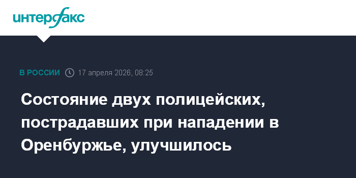 Москва. 17 апреля. INTERFAX.RU - Состояние двух сотрудников полиции, которые получили ранения в результате нападения со стрельбой в Оренбургской области, улучшилось, сообщил губернатор региона Евгений Солнцев.