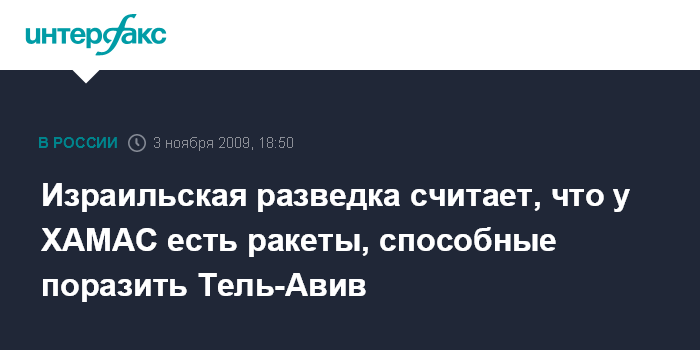 Иерусалим. 3 ноября. INTERFAX.RU - Активисты палестинского движения ХАМАС в Секторе Газа обладают ракетами, которые позволяют нанести удар по Тель-Авиву, сообщает газета Haaretz со ссылкой на заявление главы военной разведки вооруженных сил Израиля Амоса Ядлина.