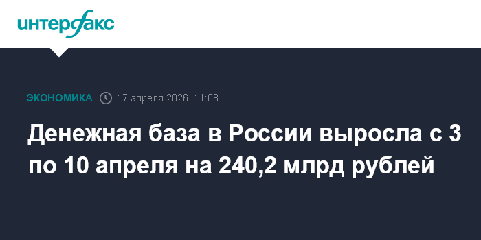 Денежная база в России выросла с 3 по 10 апреля на 240,2 млрд рублей