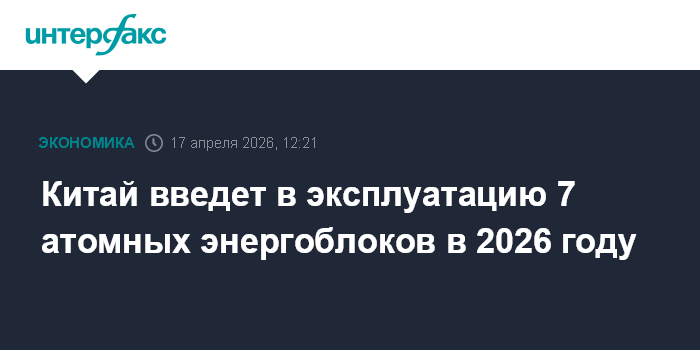 Москва. 17 апреля. INTERFAX.RU - Китай в 2026 году планирует завершить строительство и ввести в эксплуатацию семь атомных энергоблоков, сообщает China Daily со ссылкой на ежегодный отчете Китайской ассоциации ядерной энергетики (China Nuclear Energy Association).