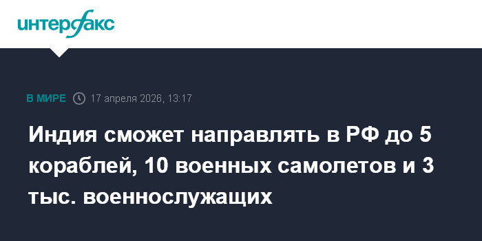 Москва. 17 апреля. INTERFAX.RU - Россия и Индия могут направить на территории друг друга до 3 тыс. военнослужащих, десяти военных самолетов и пяти кораблей в рамках действующего соглашения об укреплении сотрудничества в военной области между странами. Это следует из документа, размещенного в пятницу на официальном портале правовых актов.