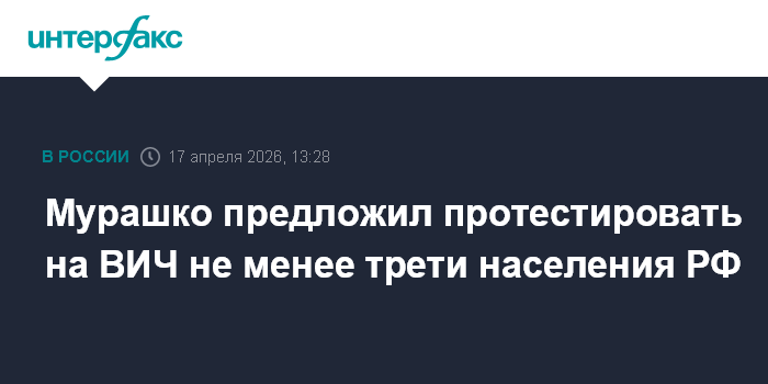 Москва. 17 апреля. INTERFAX.RU - Обследование на ВИЧ не менее трети населения РФ поможет существенно снизить риски распространения инфекции, считает министр здравоохранения РФ Михаил Мурашко.