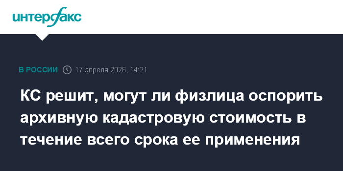 Москва. 17 апреля. INTERFAX.RU - Граждане РФ должны иметь возможность при объективной необходимости оспорить архивную кадастровую стоимость земли и недвижимости, по которой исчисляется налог, в течение всего срока ее применения, считают представители ряда органов власти в Конституционном суде РФ.