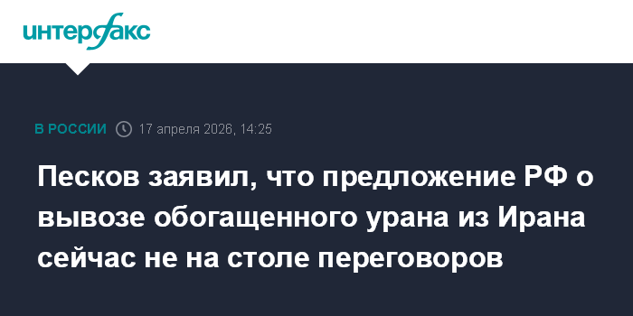 Москва. 17 апреля. INTERFAX.RU - Предложение России о вывозе обогащенного урана из Ирана сейчас не "на столе переговоров", но российская сторона к этому открыта, заявил пресс-секретарь президента РФ Дмитрий Песков.