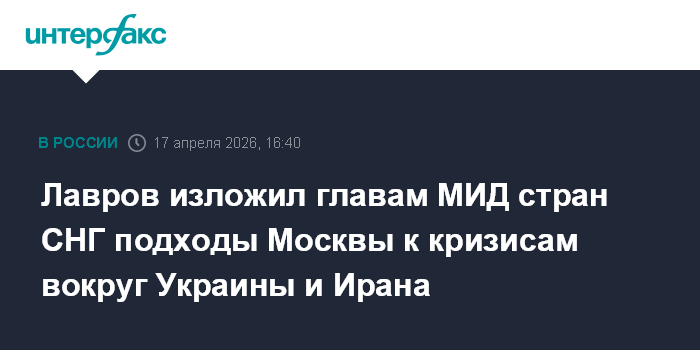 Москва. 17 апреля. INTERFAX.RU - Глава МИД России Сергей Лавров обсудил с министрами иностранных дел стран СНГ российские подходы к ряду международных и региональных проблем, в том числе к кризисам на Ближнем Востоке и вокруг Украины, сообщили на Смоленской площади.