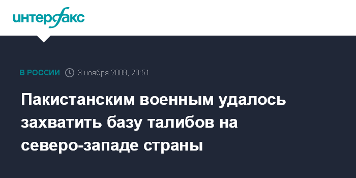 Вашингтон. 3 ноября. INTERFAX.RU - Пакистанские военные объявили о захвате базы талибов в населенном пункте Сарарога в районе Южный Вазиристан, на северо-западе страны, сообщает американская телекомпания CNN.