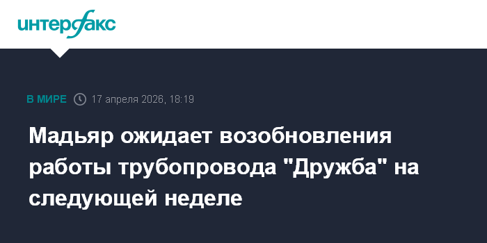 Москва. 17 апреля. INTERFAX.RU - Лидер одержавшей победу на парламентских выборах в Венгрии партии "Тиса" Петер Мадьяр в пятницу заявил, что трубопровод "Дружба" может возобновить работу на следующей неделе.